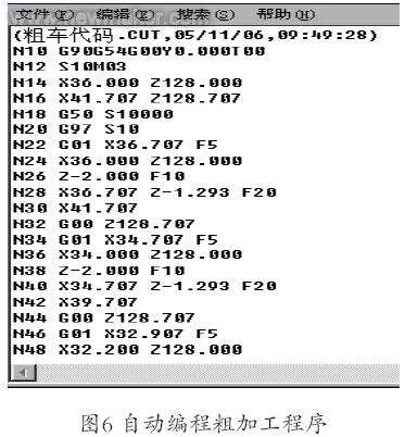 ◎单击主菜单中【应用】→【数控车】→【代码生成】,点击粗加工轨迹即可得到粗加工G代码程序,如图6所示。