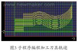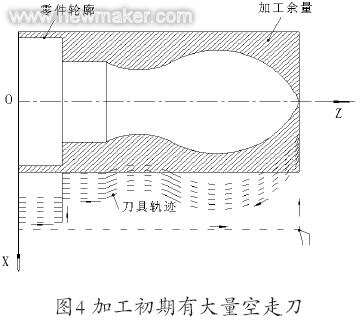 可以加工出所需工件,但在加工R30圆弧时出现了刀具干涉,经过重新刃磨刀具,第二次加工才得以成功。该种编程方法的优点是:只要改变刀具加工起点,通过反复调用轮廓子程序,可以多次加工同一个形状的轮廓,做到层层去除加工余量,最后达到零件尺寸的目的,程序文件短。但循环次数多,在加工初期有大量空走刀现象(见图4),加工效率极低。并且,程序中刀具加工起点和循环次数的确定是编程的难点,对编程初学者来说这两个参数的确定是非常容易出错的,循环次数计算错误会导致轮廓尺寸偏大或偏小。而且,华中I型数控系统在加工前无法进行刀具干涉检查,对加工不利。