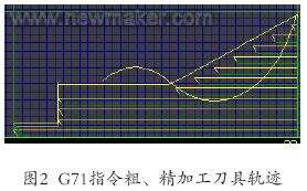 图2为机床上加工的刀具走刀路线。程序通过加工,发现该零件加工有过切现象,从程序结构和加工的走刀路线可以看出,G71指令的粗加工走刀路线是一组平行与回转轴的平行直线,它只能加工母线单调变化的轴类零件(单调上升或单调下降),对于“凹凸型”或“波浪型”母线的轴类零件用它来加工会产生过切,不适用。