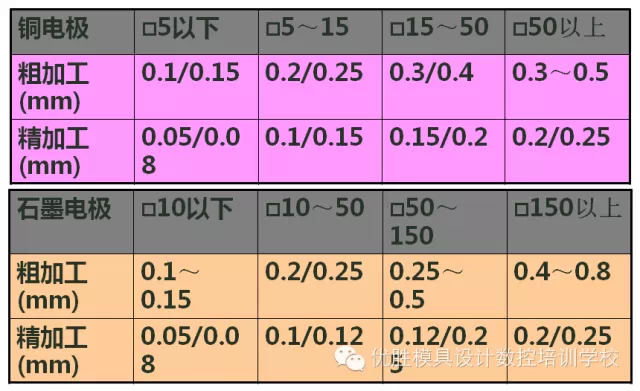 根据放电面积和电极特点合理设置放电火花位,特殊情况时最好与EDM部门沟通,共同商定所用火花位的大小。也可以参考下表来设定火花位的大小。
